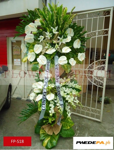 These Funeral Flower Standee, Standing Arrangement of White Anthuriums, Casablanca Lilies, Orchids and Tuberoses (FP-S18) is one of our funeral flower arrangement with free funeral flower delivery. Compose of Standing Arrangement of White Anthuriums, Casablanca Lilies, Orchids and Tuberoses.