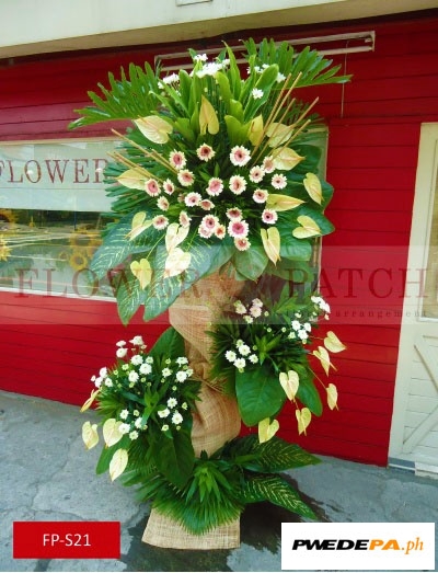 These Funeral Flower Standee, Standing Arrangement of Anthuriums, Gerberas and Mums (FP-S21) is one of our funeral flower arrangement with free funeral flower delivery. Compose of Standing Arrangement of Anthuriums, Gerberas and Mums.