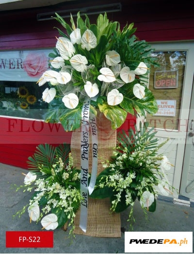 These Funeral Flower Standee, Standing Arrangement of White Anthuriums Orchids and Tuberoses (FP-S22) is one of our funeral flower arrangement with free funeral flower delivery. Compose of Standing Arrangement of White Anthuriums Orchids and Tuberoses.