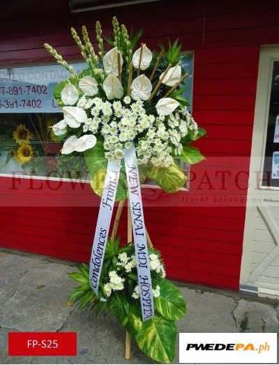These Funeral Flower Standee, Standing Arrangement of White Anthuriums, Mums and Tuberoses (FP-S25) is one of our funeral flower arrangement with free funeral flower delivery. Compose of Standing Arrangement of White Anthuriums, Mums and Tuberoses.